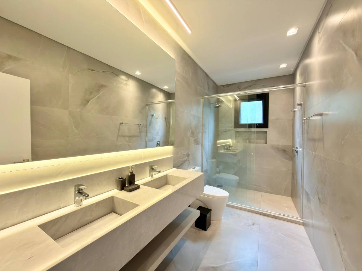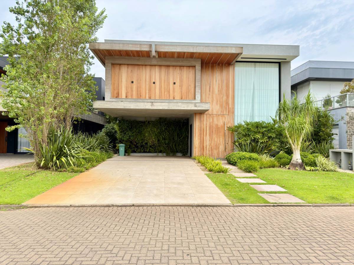 - 05 suítes (01 térrea) - 450m² de área construída - beira lago com alto padrão Sobrado finamente decorado e completamente mobiliado, com living em três ambientes, lareira e excelente padrão de acabamento. Conta com lavabo, persianas automatizadas e ambientes amplos, pensados para conforto e sofisticação. A área externa dispõe de piscina de concreto e paisagismo, proporcionando um espaço ideal para lazer e convivência. Imóvel exclusivo, pronto para uso, com alto nível construtivo. Localizado em Xangri-Lá. Para mais informações, entre em contato conosco.